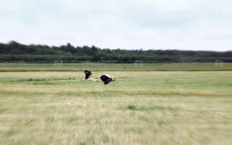 Белые аисты летают над полем летом