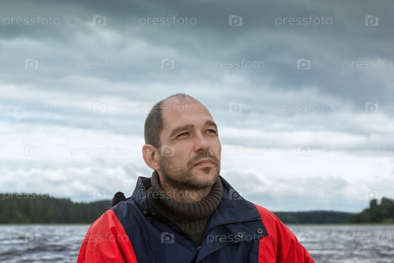 Концептуальный портрет бородатого мужчины на фоне пасмурного неба
