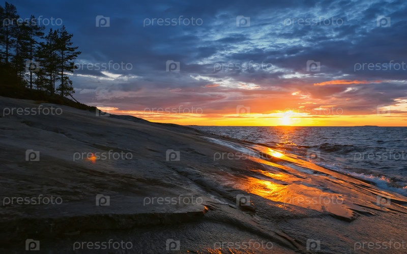 Золотой закат в грозовом небе над Онежским озером