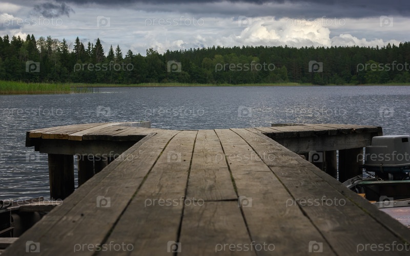 Вид на лесное озеро с деревянного пирса
