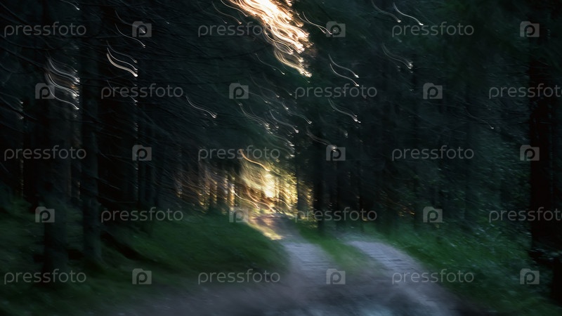 Движение размыло фон полос солнечного света в темном лесу