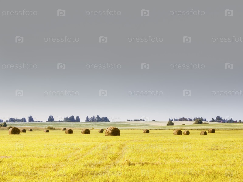 Желтое скошенное поле под серым небом - сельский пейзаж