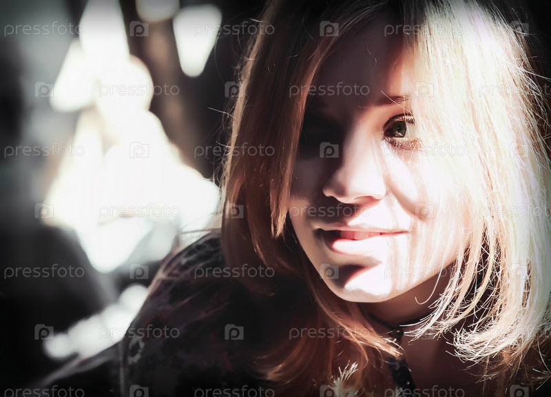 Контраст солнечного света и теней на лице улыбающейся молодой блондинки