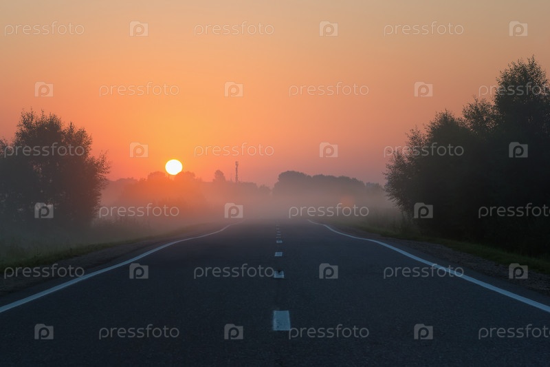 Пустая дорога, ведущая к золотому восходу солнца туманным утром