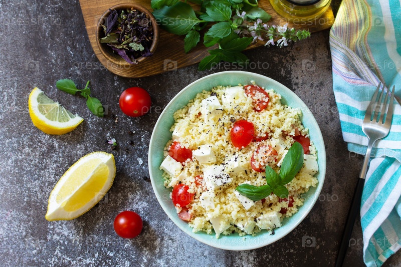 Восточная кухня. Полезный салат с кускусом, помидорами, сыром фета, базиликом, перцем чили и оливковым маслом. Вид сверху на плоский фон