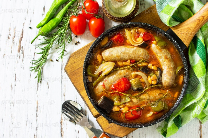 Рагу из фасоли, овощей и копченых колбас с томатным соусом на сковороде на деревянном столе. Вид сверху на плоский фон. Скопируйте пространство