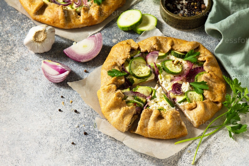 Полезная выпечка из ржаной муки, десертное диетическое питание. Галетте с цукини, луком и фетой на светлом каменном столе. Скопируйте пространство