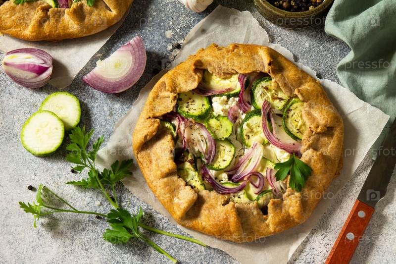 Полезная выпечка из ржаной муки, десертное диетическое питание. Галетте с цукини, луком и фетой на светлом каменном столе
