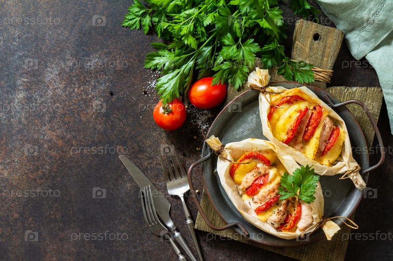 Здоровое и диетическое питание. Индейка, запеченная с помидорами и сыром на каменной столешнице. Вид сверху на плоский фон. Скопируйте пространство