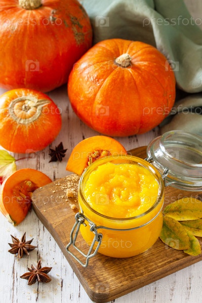 Тыквенное пюре со специями и тыквой на деревянном столе