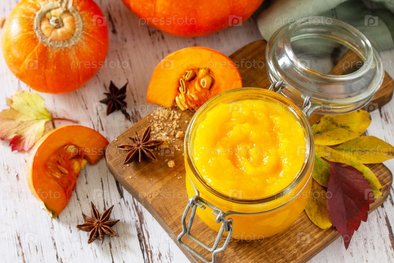 Тыквенное пюре со специями и тыквой на деревянном столе