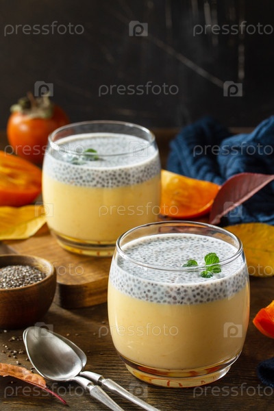 Осенний десерт. Домашняя панна котта с фруктами хурмы и семенами чиа на деревянном столе. Скопируйте пространство