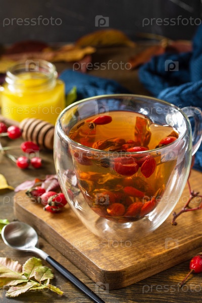 Здоровый зимний витаминный напиток. Горячий чай из шиповника с медом и сухофруктами на деревянном столе