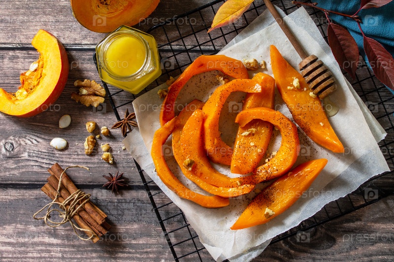 Тыквенный десерт. Запеченные ломтики тыквы с медом, корицей и грецкими орехами на деревенском столе. Вид сверху на плоский фон