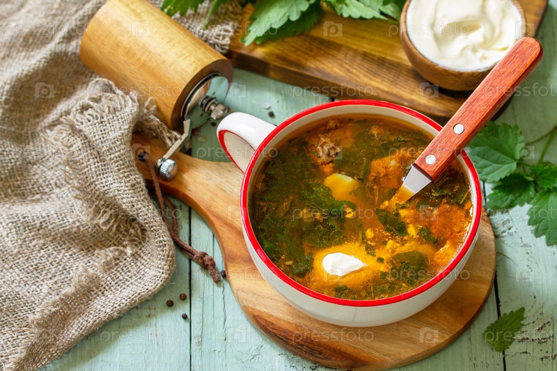 Свежая домашняя крапива и мясной суп со сметаной на деревенском столе