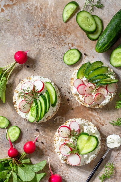 Бутерброды из хрустящего хлеба с рикоттой, редисом и свежим огурцом на светлой или сланцевой столешнице. Вид сверху на плоский фон. Скопируйте пространство