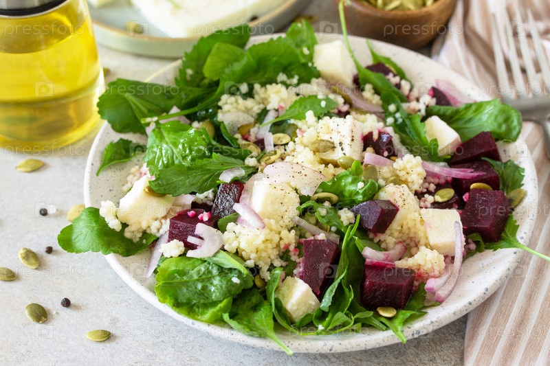 Полезный салат с кускусом, мягким сыром, свеклой и заправкой из винегрета