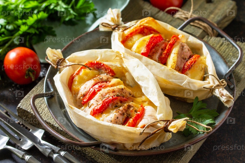 Здоровое и диетическое питание. Индейка, запеченная с помидорами и сыром на каменной столешнице