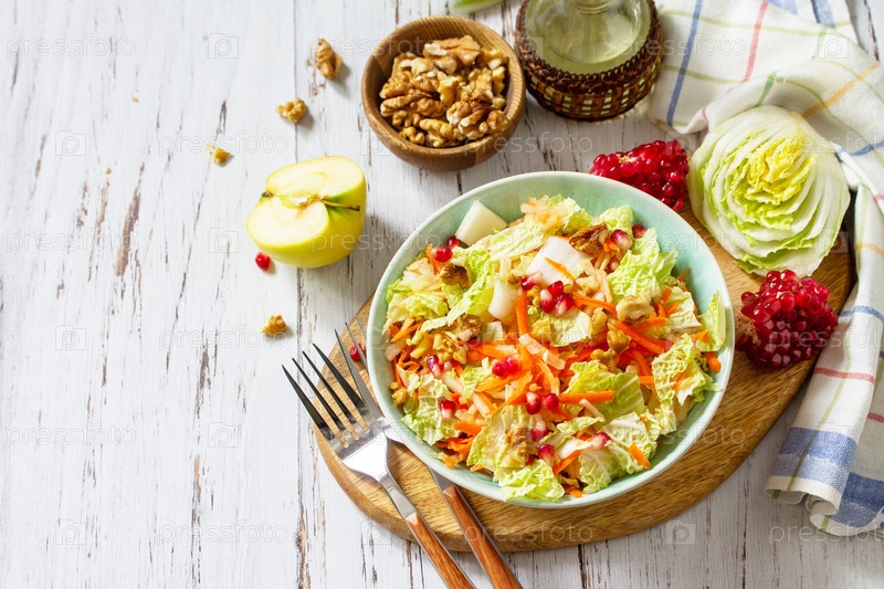 Диетический салат из свежих овощей из китайской капусты, моркови, яблок, орехов и граната с винегретной заправкой на белом деревянном столе. Скопируйте пространство