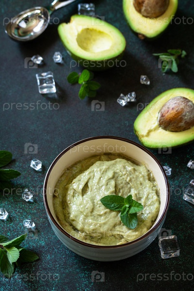 Мороженое, сладкая закуска или десерт. Домашнее фруктовое мороженое из авокадо, летний сорбет из тропических фруктов на каменном столе