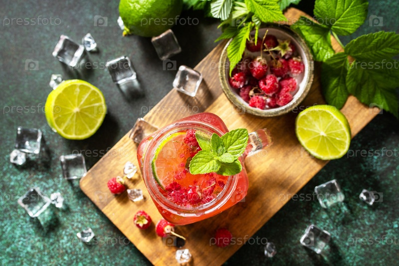 Летние напитки, бар безалкогольных напитков. Освежающие стаканы пьют малину с мятным лаймом и льдом на темном каменном столе. Вид сверху на плоский фон