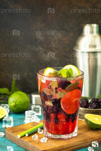 Летний освежающий напиток с ежевикой, мятой, лаймом и льдом, мохито или содовой из ежевики, на темном каменном столе. Скопируйте пространство