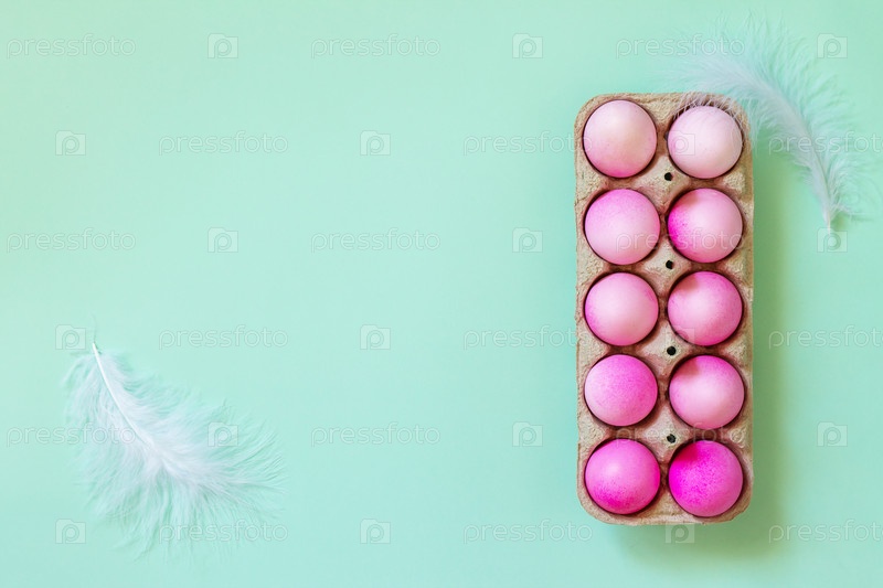 Минимальная пасхальная концепция. Пасхальные элементы, бумажная коробка с яйцами в розовых тонах на пастельно-зеленом фоне. Плоская планировка, вид сверху. Скопируйте пространство