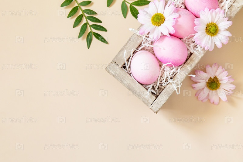 Минимальная концепция Пасхи. Пасхальные яйца окрашены в розовый цвет на модном пастельном фоне. Плоская планировка, вид сверху