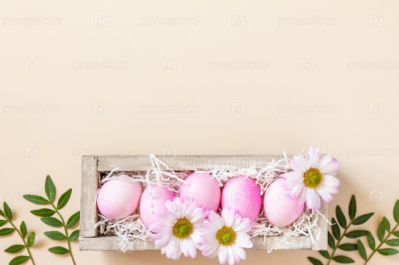 Минимальная концепция Пасхи. Пасхальные яйца окрашены в розовый цвет на модном пастельном фоне. Плоская планировка, вид сверху