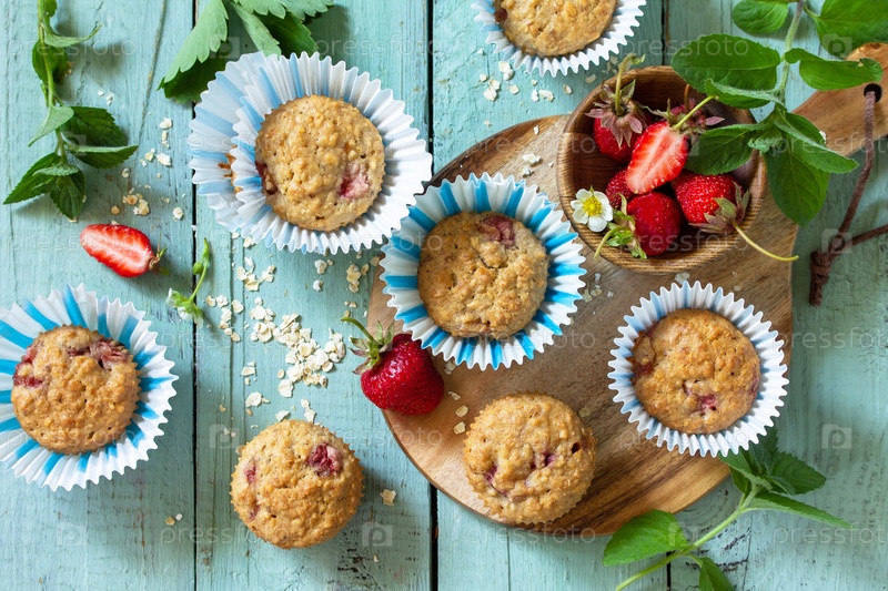 Здоровая домашняя выпечка, летний десерт. Безглютеновые клубничные овсяные кексы и свежая клубника на деревенском деревянном столе. Плоская планировка, вид сверху
