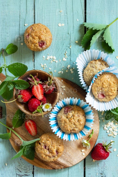 Здоровая домашняя выпечка, летний десерт. Безглютеновые клубничные овсяные кексы и свежая клубника на деревенском деревянном столе. Плоская планировка, вид сверху