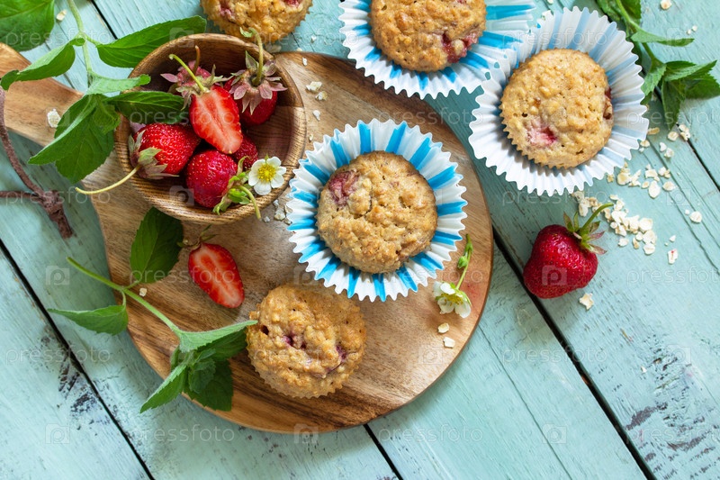 Здоровая домашняя выпечка, летний десерт. Безглютеновые клубничные овсяные кексы и свежая клубника на деревенском деревянном столе. Плоская планировка, вид сверху. Скопируйте пространство