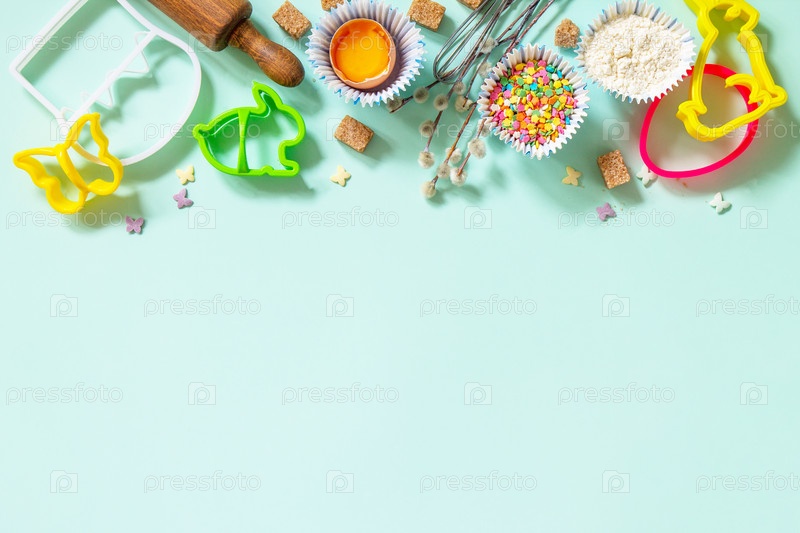 Выпечка или приготовление пищи фон. Ингредиенты для праздничной пасхальной выпечки. Кухонная утварь, мука, коричневый сахар, яйца и масло на светло-зеленом фоне. Плоская планировка, вид сверху. Скопируйте пространство