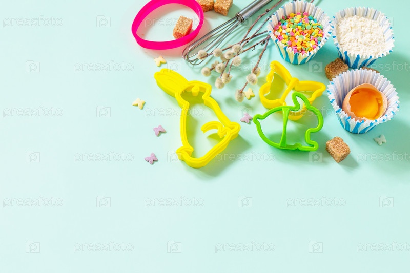Выпечка или приготовление пищи фон. Ингредиенты для праздничной пасхальной выпечки. Кухонная утварь, мука, коричневый сахар, яйца и масло на светло-зеленом фоне. Скопируйте пространство