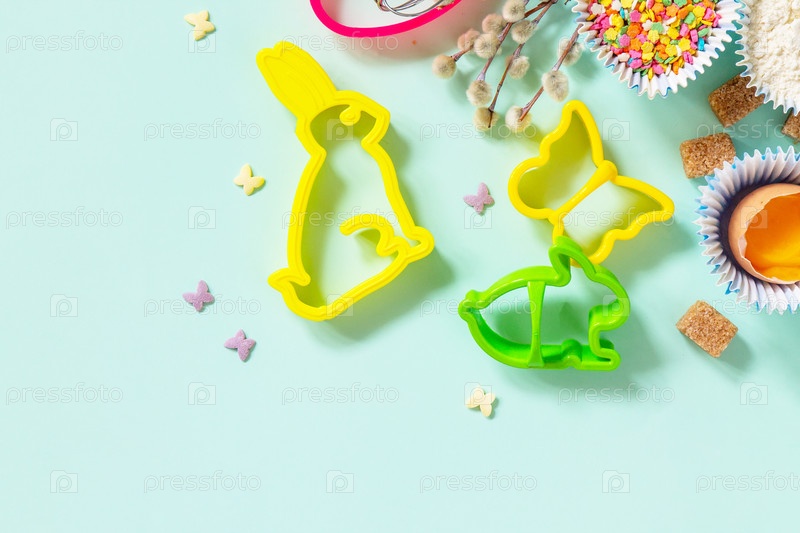 Выпечка или приготовление пищи фон. Ингредиенты для праздничной пасхальной выпечки. Кухонная утварь, мука, коричневый сахар, яйца и масло на светло-зеленом фоне. Плоская планировка, вид сверху. Скопируйте пространство