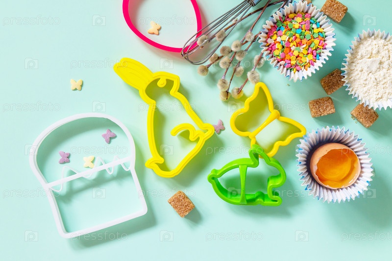 Выпечка или приготовление пищи фон. Ингредиенты для праздничной пасхальной выпечки. Кухонная утварь, мука, коричневый сахар, яйца и масло на светло-зеленом фоне. Плоская планировка, вид сверху