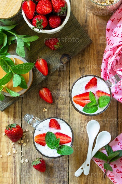 Здоровое питание. Концепция завтрака. Домашняя мюсли с клубникой, йогуртом, семенами чиа и свежими ягодами на деревенском столе. Плоская планировка, вид сверху