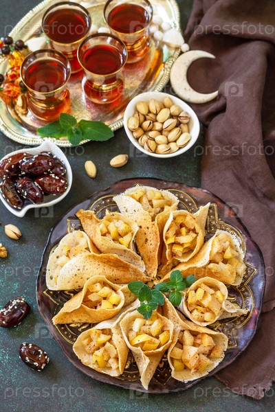 Арабская кухня. Рамадан Карим Праздничный. Меню Рамадана, арабский блин катаеф (катаев, катаеф) с яблочной начинкой и корицей