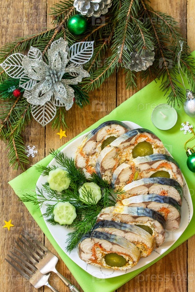 Праздничная закуска. Запеченный рулет из скумбрии, фаршированный сыром, морковью, яйцом и маринованным огурцом, подается к рождественскому столу. Вид сверху на плоский фон