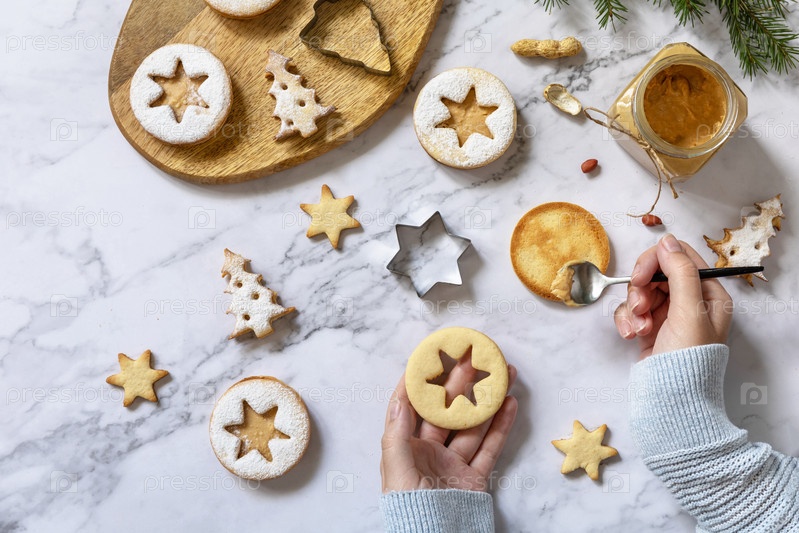 Сладкий подарок своими руками. рождественские или новогодние печенье Linzer с начинкой из арахисового масла на мраморной поверхности. вид сверху на плоский фон. скопируйте пространство