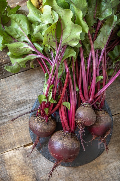 Свежая органическая спелая сочная свекла на деревянном кухонном столе. Концепция органического питания и осеннего сбора овощей. Вид сверху на плоский фон