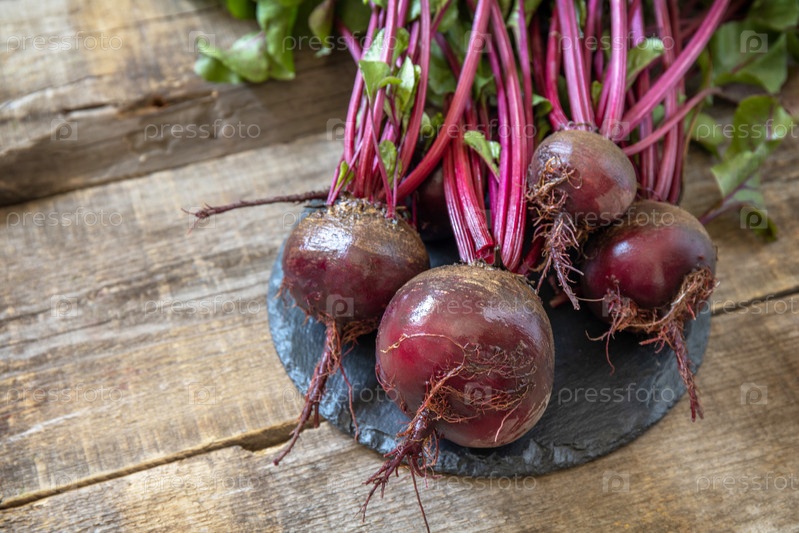 Свежая органическая спелая сочная свекла на деревянном кухонном столе. Концепция органического питания и осеннего сбора овощей. Скопируйте пространство