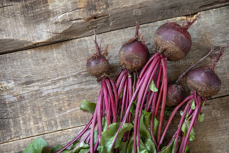 Свежая органическая спелая сочная свекла на деревянном кухонном столе. Концепция органического питания и осеннего сбора овощей. Вид сверху на плоский фон. Скопируйте пространство