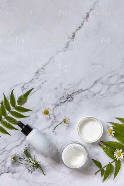 Натуральные косметические продукты. Ежедневная гигиена и женский здоровый уход за кожей. Косметический крем и сыворотка для ухода за кожей с цветками ромашки на мраморной столешнице. СПА натуральный органический косметический продукт