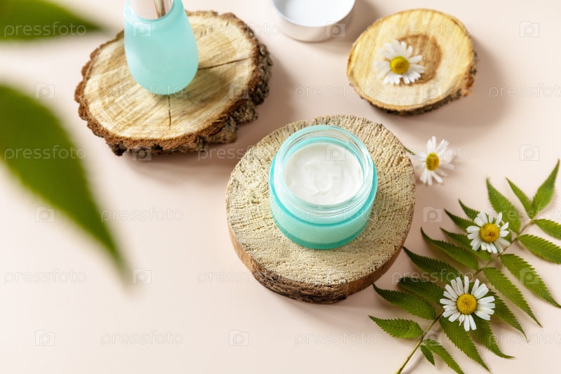 Ежедневная гигиена и женский здоровый уход за кожей. Косметический крем и сыворотка для лица с цветками ромашки на синем фоне. СПА натуральный органический косметический продукт