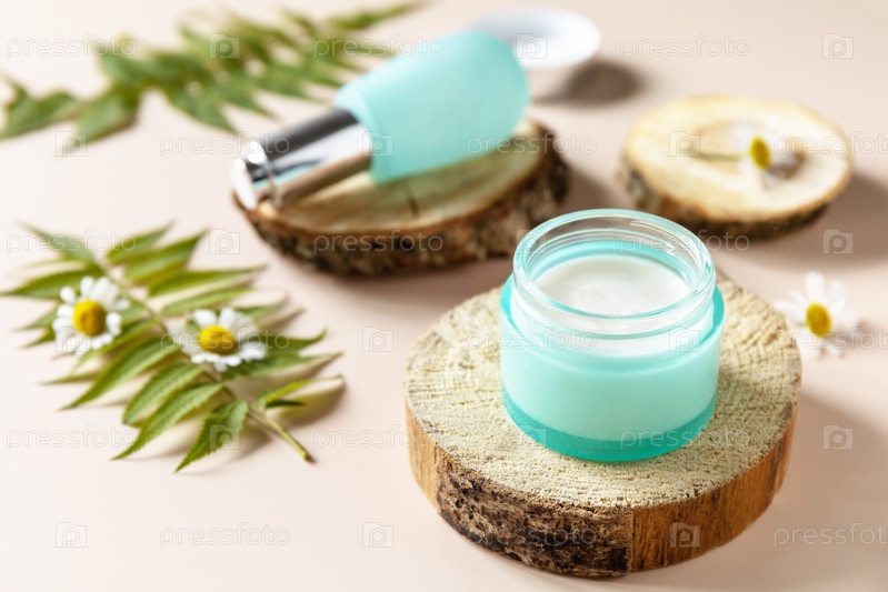 Ежедневная гигиена и женский здоровый уход за кожей. Косметический крем и сыворотка для лица с цветками ромашки на синем фоне. СПА натуральный органический косметический продукт