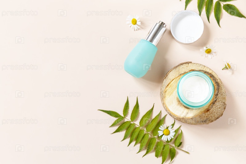 Ежедневная гигиена и женский здоровый уход за кожей. Косметический крем и сыворотка для лица с цветками ромашки на синем фоне. СПА натуральный органический косметический продукт. Плоская планировка, вид сверху. Скопируйте пространство