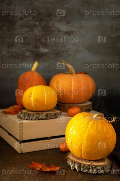 Концепция Хэллоуина или Дня благодарения, осенний урожай. Праздничные осенние сезонные украшения с тыквами и листьями на деревенском деревянном фоне. Скопируйте пространство