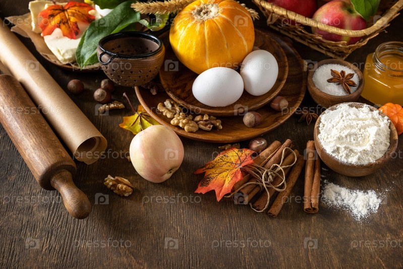 Сезонная еда осенняя выпечка фон - ингредиенты для выпечки (тыква, яблоки, яйца, мука, сахар и специи) на деревянном столе. Скопируйте пространство