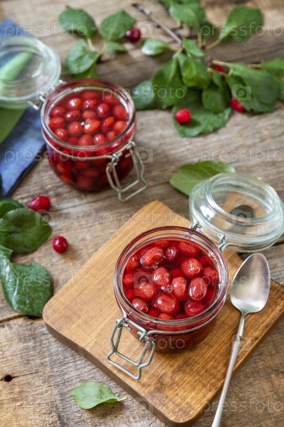 Домашнее варенье из кизила на деревянном фоне. Органический джем, здоровая пища